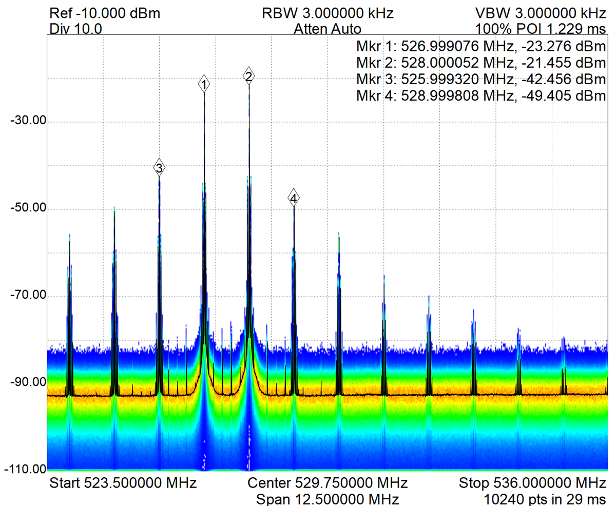 Note: These results were not as expected and the IMDs are of higher power than in test #1. This method is often seen in practice and it is commonly assumed that this method would reduce the generation of IMDs testing does not support this.